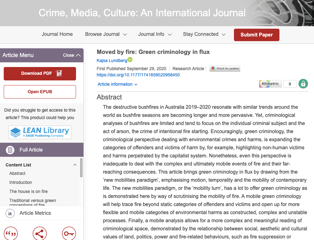 I am thrilled to announce that my article on fire, mobility, movement and green criminology has been published in Crime Media Culture: https://journals.sagepub.com/doi/full/10.1177/1741659020958450